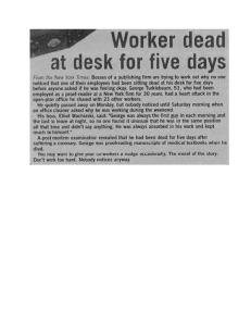 nervously waited outside the ward to see for themselves what the terrible phenomenon was all about. Some were holding wooden crosses, prayer books, and other holy objects to ward off the evil spirits. Just when the clock struck 11:00 , Pookie Johnson, the part-time Sunday sweeper, entered the ward and unplugged the life support system so he could use the vacuum cleaner.