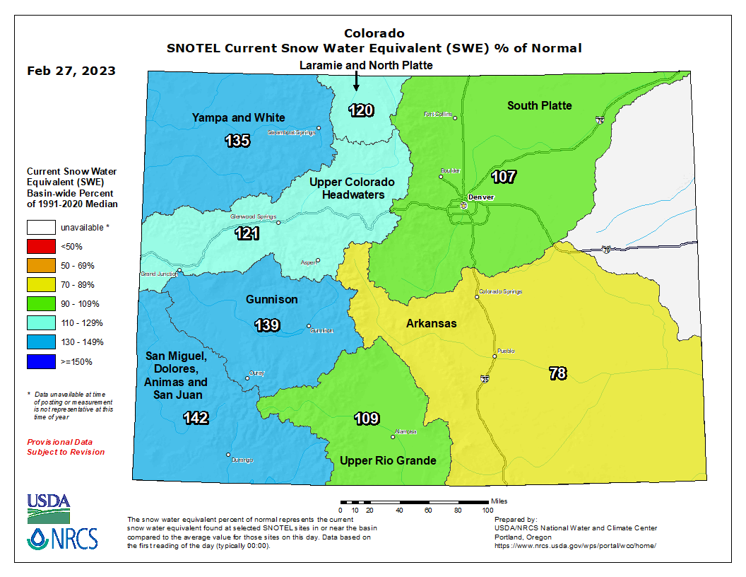 Colorado’s snowpack is tremendous this year. If this interests you, there is a nice website with a map here. It looks good, with only the far eastern plains and the Arkansas River Basin being the only two Zones with below average #SnowPack. But, for you, HERE IT IS…